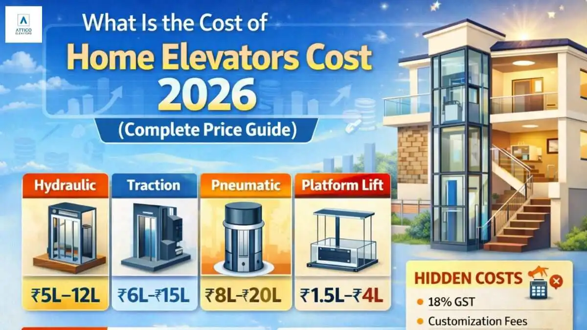 The cost of home elevators in India in 2026 varies based on type, design, and installation needs. On average, a basic home lift starts from ₹4–5 lakhs, while premium models with advanced features can go up to ₹15–25 lakhs or more.